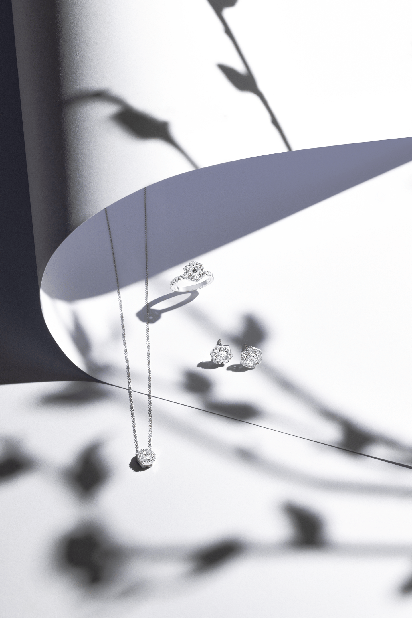We designed an editorial photoshoot where fine diamond jewellery is elevated through minimal yet striking compositions. The clean geometric forms of the set were softened by delicate plant shadows, creating depth, contrast, and a subtle link to nature. This interplay of light and organic detail highlighted the jewellery’s brilliance while adding a poetic dimension to the images. Each piece was captured both in close-up focus and within refined still-life arrangements, balancing product clarity with artistic atmosphere. The outcome is a visual narrative that fuses timeless luxury with contemporary aesthetics, strengthening the brand’s identity and distinctiveness in the fine jewellery market.